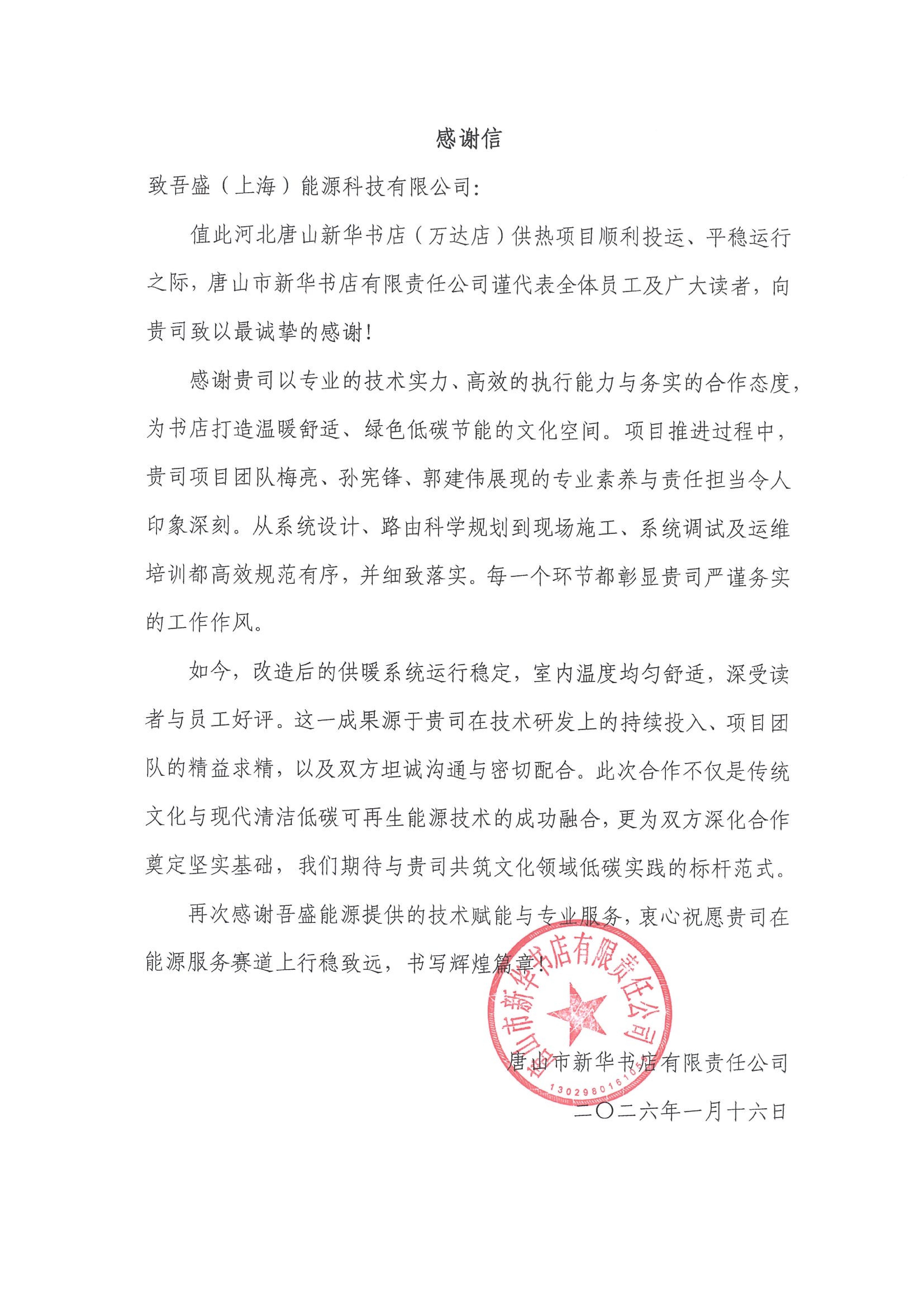 此项目的成功投运,不仅是吾盛能源供热技术3.0的首例全场景验证,更以全流程闭环能力彰显了公司在集成创新与高效落地上的核心竞争力。吾盛能源项目团队凭借严谨作风贯穿始终,每个环节均体现吾盛技术为基、责任为核的服务理念,为新华书店打造出兼具舒适体验与绿色节能的文化空间,获得唐山新华书店的官方感谢信认可,彰显国有文化企业与能源服务企业协同合作的价值。